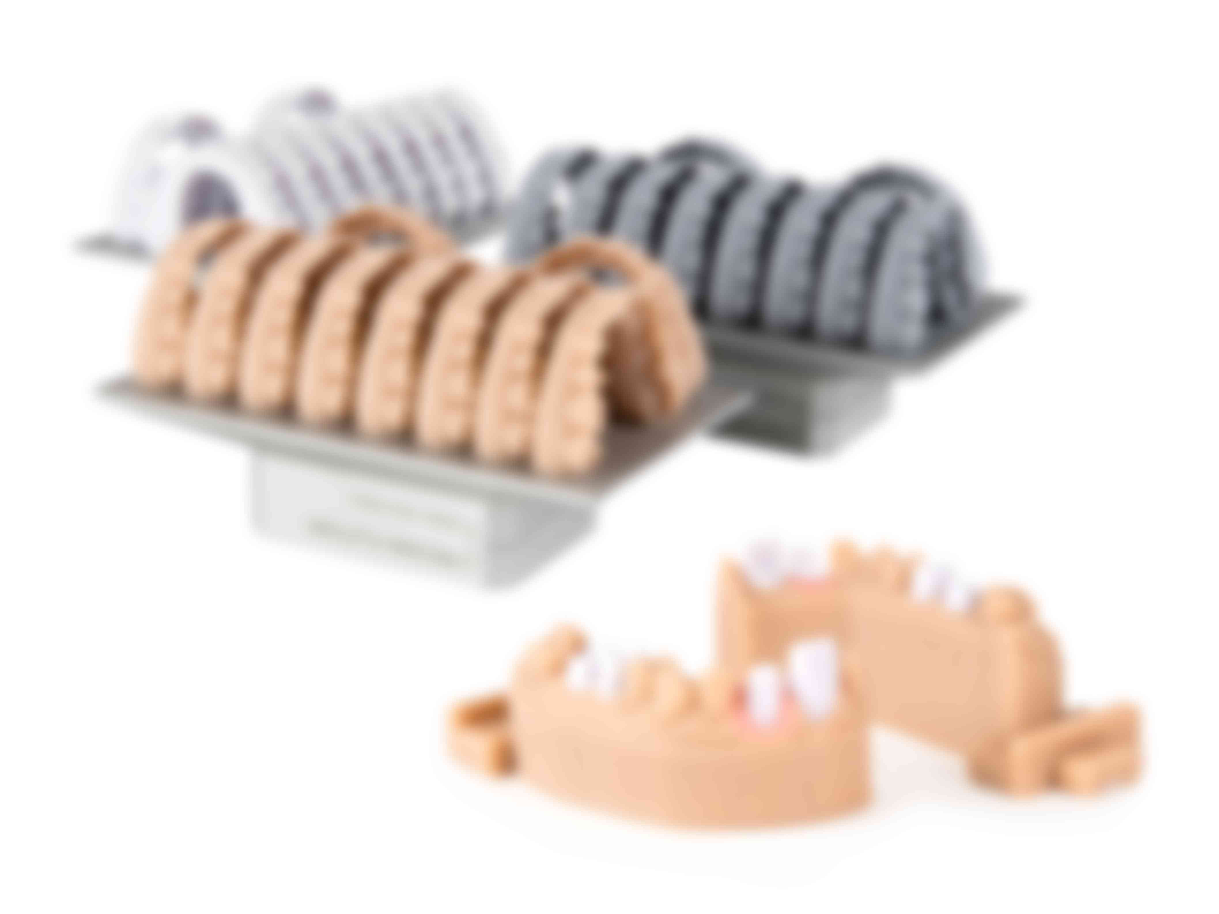 The visual and mechanical properties of the Model series were tuned to meet the requirements of dental and stomatology applications. Even the most intricate details are sharp and perfectly visible thanks to the resolution capabilities and opacity of the resin. Alabaster White, Solid Grey, and Neutral Beige resins are especially suited not only for dental model applications but also for thermoforming bracelets and heat-shaping orthodontic models.